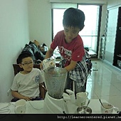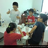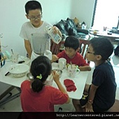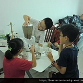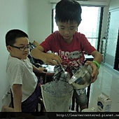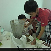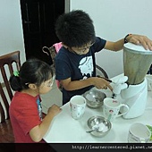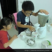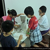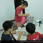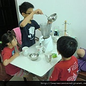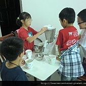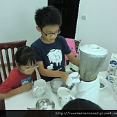 孩子們主動的幫忙,完成前置作業(準備果汁機、拿牛奶、冰塊、杯子等)後,就開心的依自己的口味,特製自己喜歡喝的綠豆沙牛奶。