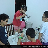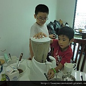 每位孩子的做點心的方法不盡相同,但他們都十分喜歡吃自己親手做的點心。這次的綠豆沙牛奶,不像外賣的綠豆沙牛奶般這麼綿密,因為料理方式不同。我煮的綠豆湯,習慣吃起來有點顆粒感,所以不會將綠豆煮得十分軟爛,因此,就算經過果汁機攪拌過後的綠豆,仍帶有顆粒,吃起來的感覺比較不像綠豆沙,但是,對孩子們來說,不管像不像綠豆沙都沒有關係,只要可以自己做點心就好囉。