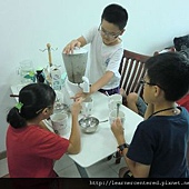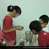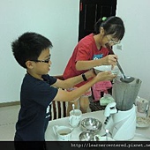 Linda的綠豆沙牛奶,加入的牛奶較多,綠豆湯較少。在製作點心的過程中,因為Linda的個子較嬌小,力氣也較小,於是Brian主動的幫她忙,很棒!